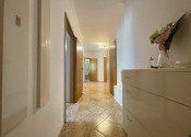 Po vstupe do bytu sa ocitneme na chodbe. Z chodby sa dostaneme do všetkých miestností, z ľavej strane sú izby z pravej strane je samostatná toaleta a vstavaná skriňa. V kuchyne je prekrásna kuchynská linka v tvare U so zabudovanými spotrebičmi a s práčkou. V kúpeľni zmestí rohová vaňa.