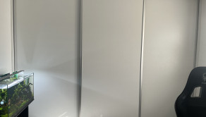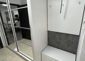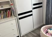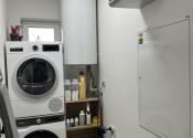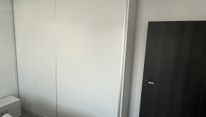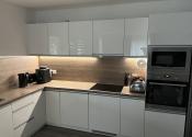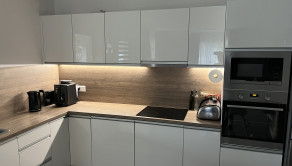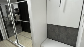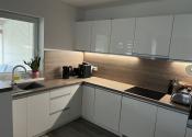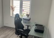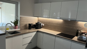 K vstavanej U-kuchyni patrí barový pult so stoličkami, granitový drez, vstavaná rúra, vstavaná mikrovlnná rúra a vstavaný digestor. K kuchyni patrí aj špajza, v ktorom je masívny regál na mieru, vhodný aj na ťažšie kompóty. V kúpeľni sa nachádza WC Geberit, rohová vaňa, umývadlo so skrinkou a zrkadlom a bezrámová sklenená sprcha s dverami a zástenou. Nad vaňou je menší nástenný nábytok na uloženie uterákov. V spálni je vstavaná skriňa s posuvnými dverami. V kancelárskej miestnosti sa na jednej stene nachádza vstavaná skriňa. V predsieni sa nachádza zrkadlová skriňa s výškou 215 cm a dĺžkou 3 m na kabáty a topánky. Na všetkých oknách sú robené na mieru sieťky proti hmyzu. Na oknách v izbách sú robené na mieru záclony alebo rolety/žalúzie, ktoré poskytujú úplnú tmu. Na terasových dverách a okne kancelárie sú robené na mieru deň a noc rolety. V celom dome sú LED svetlá s nastaviteľnou intenzitou.
